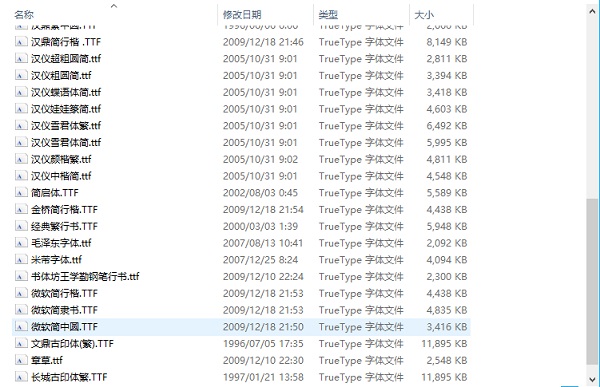 方正北魏楷书繁体,方正北魏楷书简体,方正粗倩简体,方正粗宋简体 方正大黑繁体,方正大剪纸繁体,方正大剪纸简体,方正隶书繁体 方正胖头鱼简体,方正宋黑繁体,方正铁筋隶书繁体/简体,方正祥隶繁体/简体 方正粗圆简体,方正静蕾简体,长城古印体繁,长城特粗圆体 繁启体,汉鼎繁古印,汉鼎繁中圆,汉鼎简行楷 ,汉仪超粗圆简 汉仪粗圆简,汉仪蝶语体简,汉仪娃娃篆简,汉仪雪君体繁,汉仪雪君体简 汉仪颜楷繁,汉仪中楷简,简启体,金桥简行楷,经典繁行书,毛泽东字体 米芾字体,书体坊王学勤钢笔行书,微软简隶书,微软简中圆。