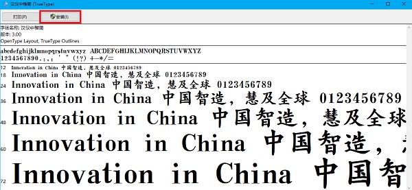 1、打开解压后文件夹,找到想要安装的字体,双击打开,然后会出现下图所示的情况,点击上方的“安装”按钮。