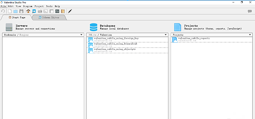 其起始页面是您可以查看所有服务器和数据库,设置新连接以及篡改服务器设置的位置。无需输入命令或完成复杂的配置过程即可创建新的SQLite或Valentina数据库。