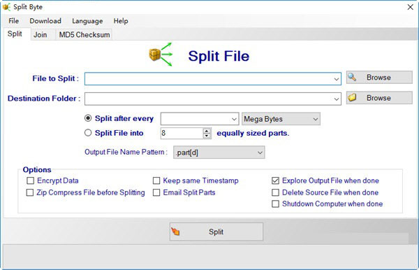 Split Byte官方版是一款十分优秀的文件分割器。Split Byte能够检查图标多语言,并翻译成38种不同的语言。软件界面简洁美观,功能强劲,可以将文件分割成指定书目的等大的较小文件,也可以将它们合并在一起,非常方便。