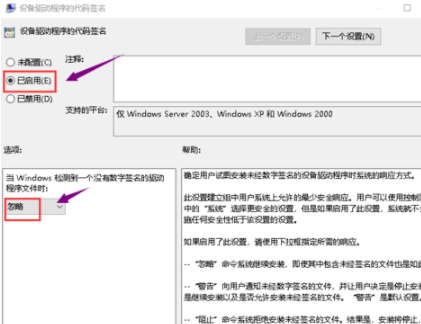 7、将配置改为已启动,同时检测到无签名驱动选择忽略,点击应用按钮。
