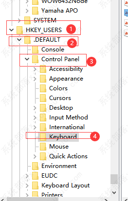 2、进入页面后依次点击“HKEY_USERS > .DEFAULT > Control Panel > Keyboard”。